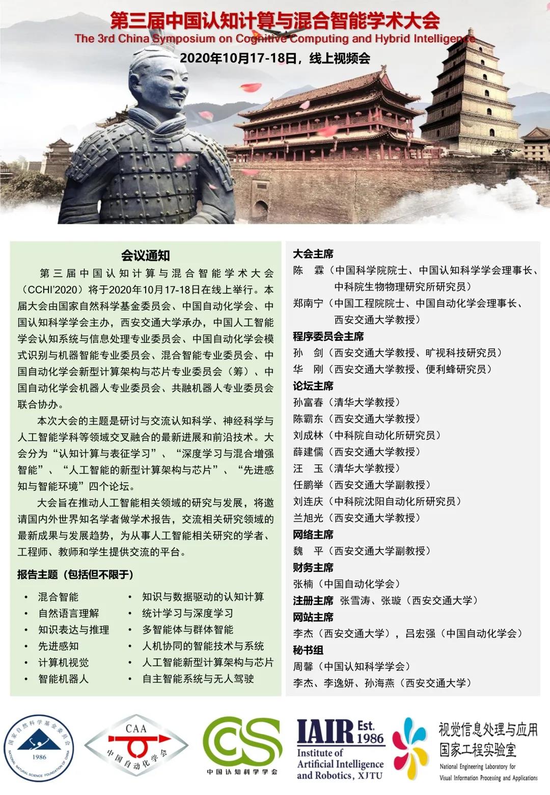 第三届中国认知计算与混合智能学术大会(CCHI2020)将于2020年10月17-18日在线上举行。本届大会由国家自然科学基金委员会、、中国认知科学学会主办,西安交通大学承办,中国人工智能学会认知系统与信息处理专业委员会、模式识别与机器智能专业委员会、混合智能专业委员会、机器人专业委员会、共融机器人专业委员会联合协办。